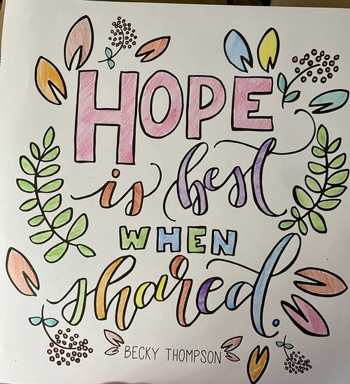 We learned so much during those two years of Christian Spiritual training, learning about listening to God, playing, relaxing in His presence, enjoying His presence. My cohort gave me a coloring page about hope, and they all signed the back with notes of encouragement to Hope with me.