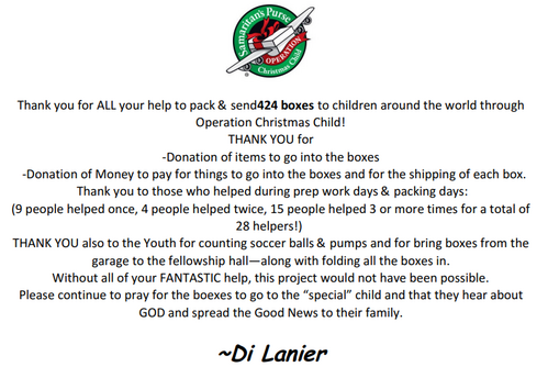 Annually, Grace Church does its part by packing and sending boxes to the distribution center so they can be delivered around the world.